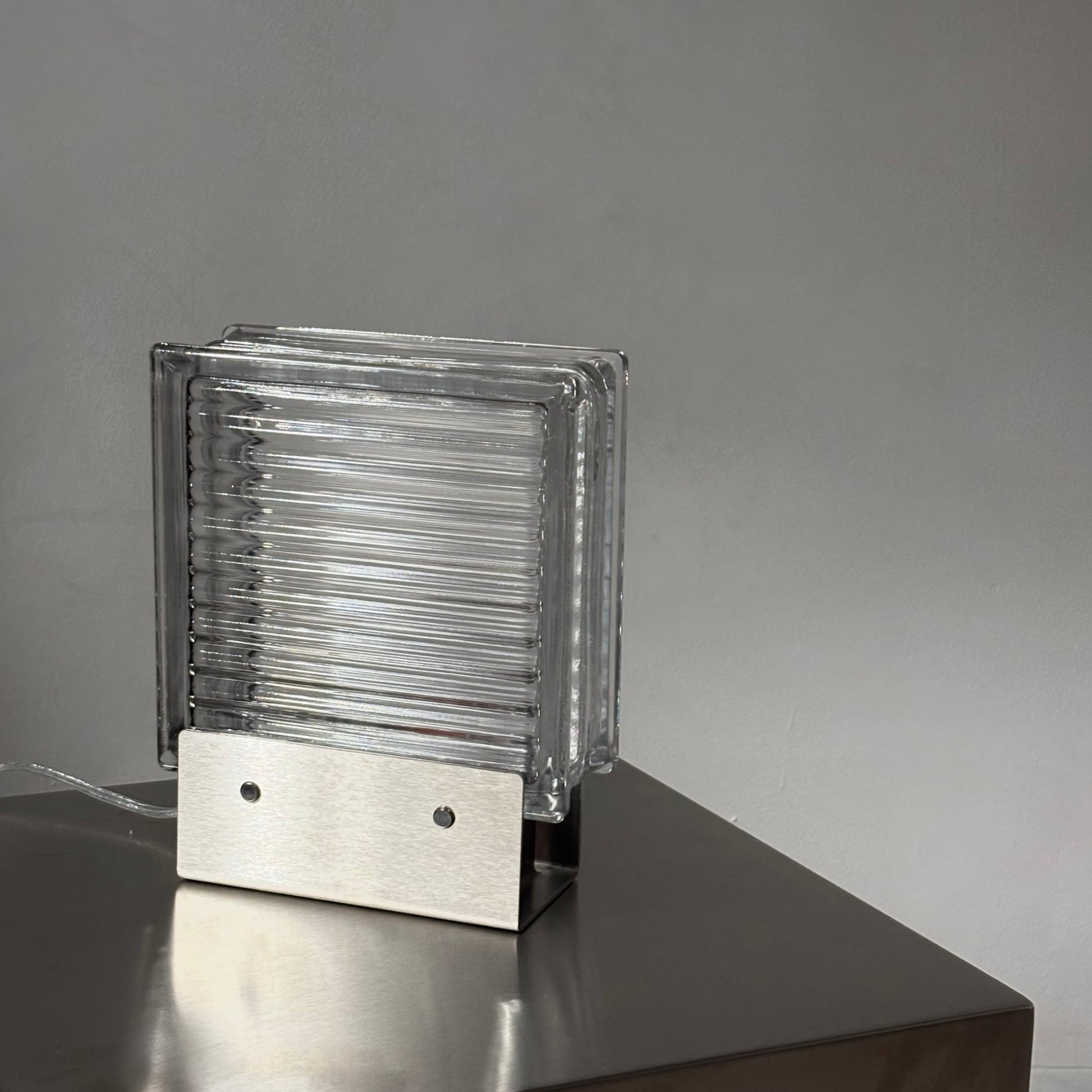 The glass block functions as a diffuser and optical element. Its vertical grooves structure the light and create a rhythmic reflection pattern when illuminated. The light source is embedded in the base and emits a warm, amber glow that is modulated by the mass and texture of the glass.