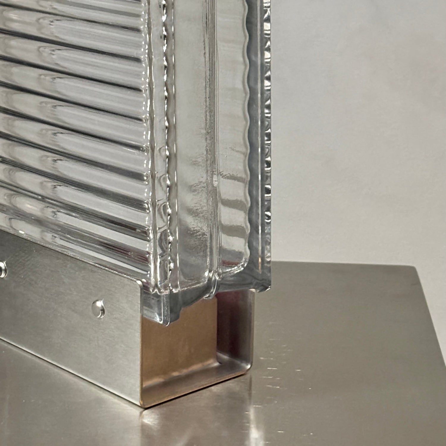 The GBL-02 is a compact table lamp composed of an industrial glass block with an internal linear pattern resting on a precisely laser cut and brushed stainless steel base. The interplay of these materials defines the lamp’s formal character: geometric, reduced, and materially precise.