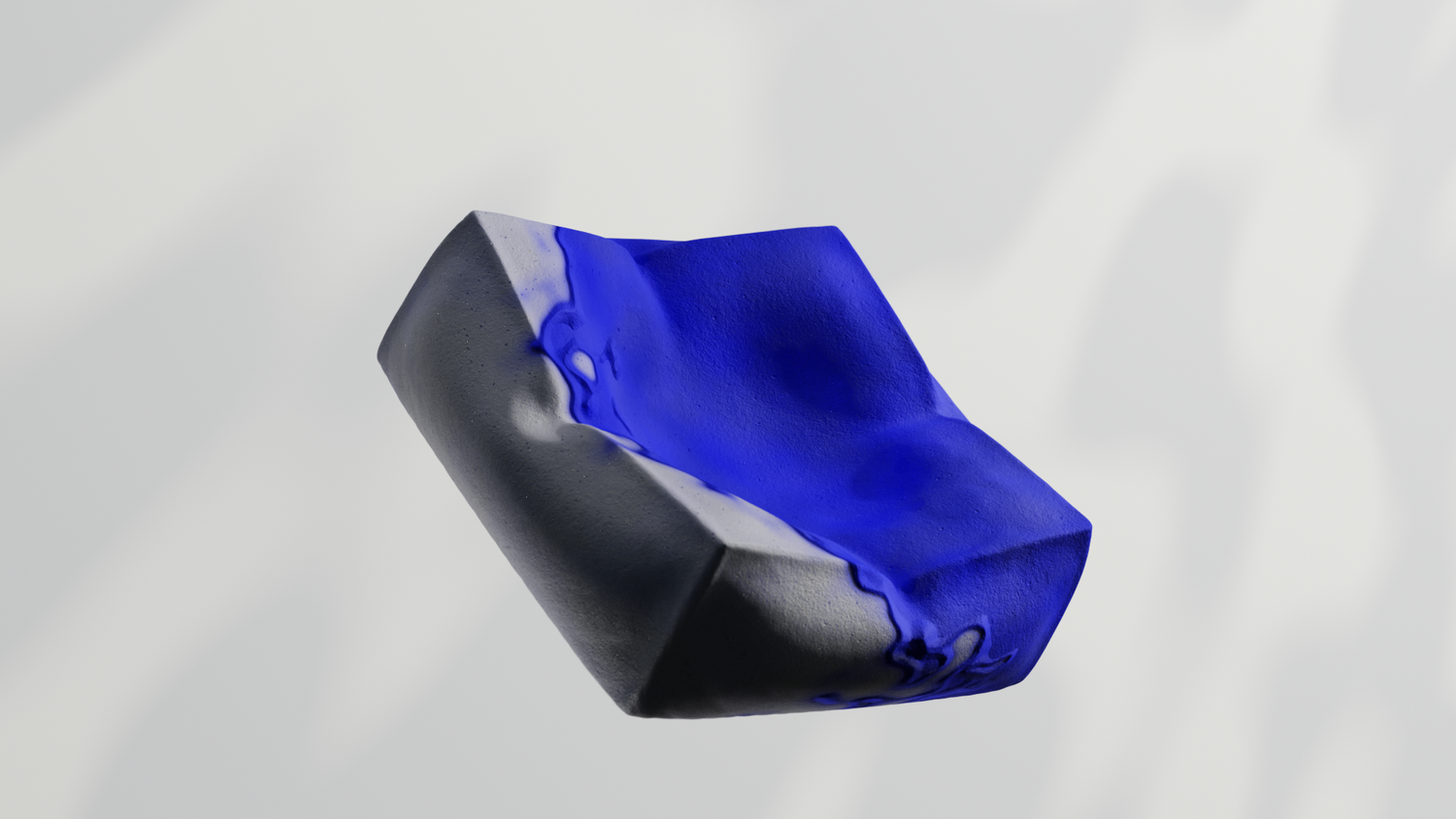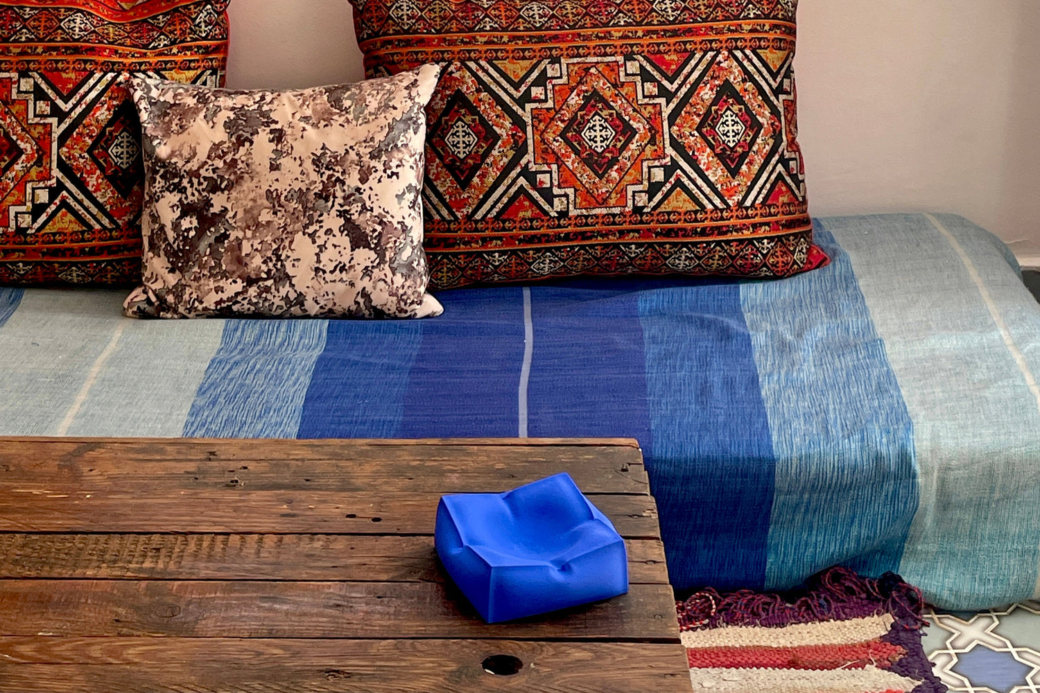 The pillow tray – ultramarine is a hand-cast concrete object finished with a deep, matte ultramarine pigment layer. Like the original, it plays with the contrast between softness and solidity, mimicking the shape of a sunken cushion while being made from solid fine concrete.